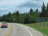Northbound view passing the south entrance gate showing the sign indicating the 50 km/h speed limit. The speed limit is raised to 80 km/h through most of the park, but is reduced in the areas around Wasagaming and Clear Lake. ![]() Photograph taken in July 2010. |