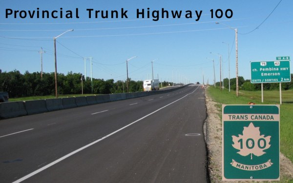 PTH 100 comprises the southern part of the Perimeter Highway that encircles the City of Winnipeg. It maintains the Trans-Canada designation and both starts and ends at PTH 1, the Trans-Canada Highway. It is twinned and divided through its entire length. Click here to show the route.