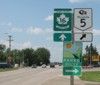 Westbound view showing the advance signage for the western junction of PTH 5. ![]() Photograph taken in July 2010. |
