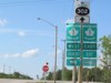 Northbound view approaching the junction of PTH 1 showing a closeup of the assembly of markers. ![]() Photograph taken in July 2012. |