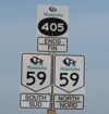 Westbound view showing a closeup of the assembly of signs at the junction of PTH 59. ![]() Photograph taken in April 2010. |