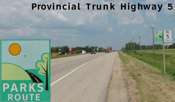 The Parks Route designation follows PTH 5 for its entire length, but the ceremonial marker is only displayed near major intersections. For more information on the Parks Route and PTH 5, please visit parksroute.ca.