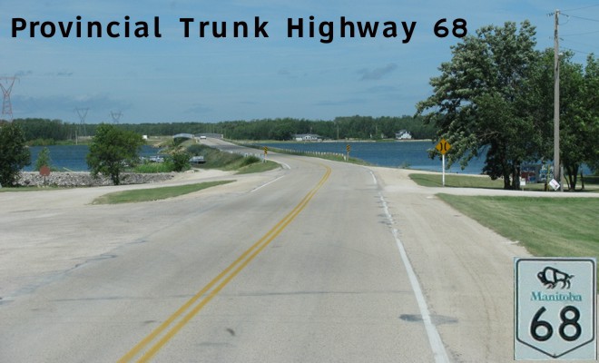 PTH 68 travels from Ste. Rose du Lac to the junction of PTH 8 west of Hnausa and the western shore of Lake Winnipeg. The highway originally joined PTH 6 at Eriksdale to PTH 8, but was later extended west to cross Lake Manitoba through the narrow straits and connect to PTH 5. The highway took its number from its original western and eastern terminii, PTH 6 and 8. Click here to show the route.