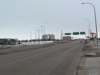 Southbound view at Plaza Drive showing the overhead signage for the intersection of Bishop Grandin Boulevard and University Crescent. ![]() Photograph taken in March 2013. |