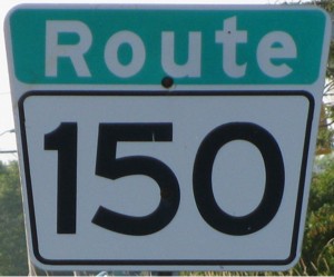 Southbound view showing the marker indicating the end of Route 150. ![]() Photograph taken in August 2009. |