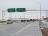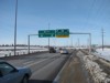 Westbound view approaching the junction of Route 90/Kenaston Boulevard. Southbound traffic on Kenaston Boulevard must use one of the two lanes in the expanded median to turn left, while northbound traffic continues ahead. This interchange was recently completed to handle the extension of Kenaston Boulevard that will not only serve the new Waverley West subdivision, but eventually reach the Perimeter Highway. ![]() Photograph taken in November 2012. |