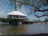 A look at the new Provencher Bridge that crosses the Red River. The restaurant on the bridge houses a toilet that cost $1 million to install. As a result, the bridge is sometimes derisively referred to as the Glen Murray Toilet Bridge, in honor of the former Winnipeg mayor who was responsible for this frivolous waste of the taxpayers' money. ![]() Photograph taken in June 2005. |