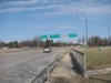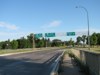 Southbound view at the northern abutment of the St. Vital Bridge showing the newly installed advance signage for Kingston Row. ![]() Photograph taken in May 2013. |