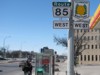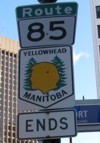 Eastbound view showing a closeup of the marker indicating the end of both Route 85 and the Yellowhead Highway. ![]() Photograph taken in January 2010. |