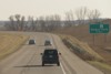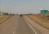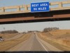 Westbound view passing under 330th Street showing the overhead signage for the next rest area, which is in North Dakota. ![]() Photograph taken in November 2009. |