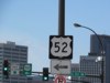 Eastbound view on Seventh Street showing the advance signage for the junction of US 52. ![]() Photograph taken in July 2014. |
