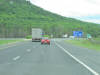Northbound view showing the sign indicating that trucks are required to use a speed limiter. ![]() Photograph taken in June 2023. |